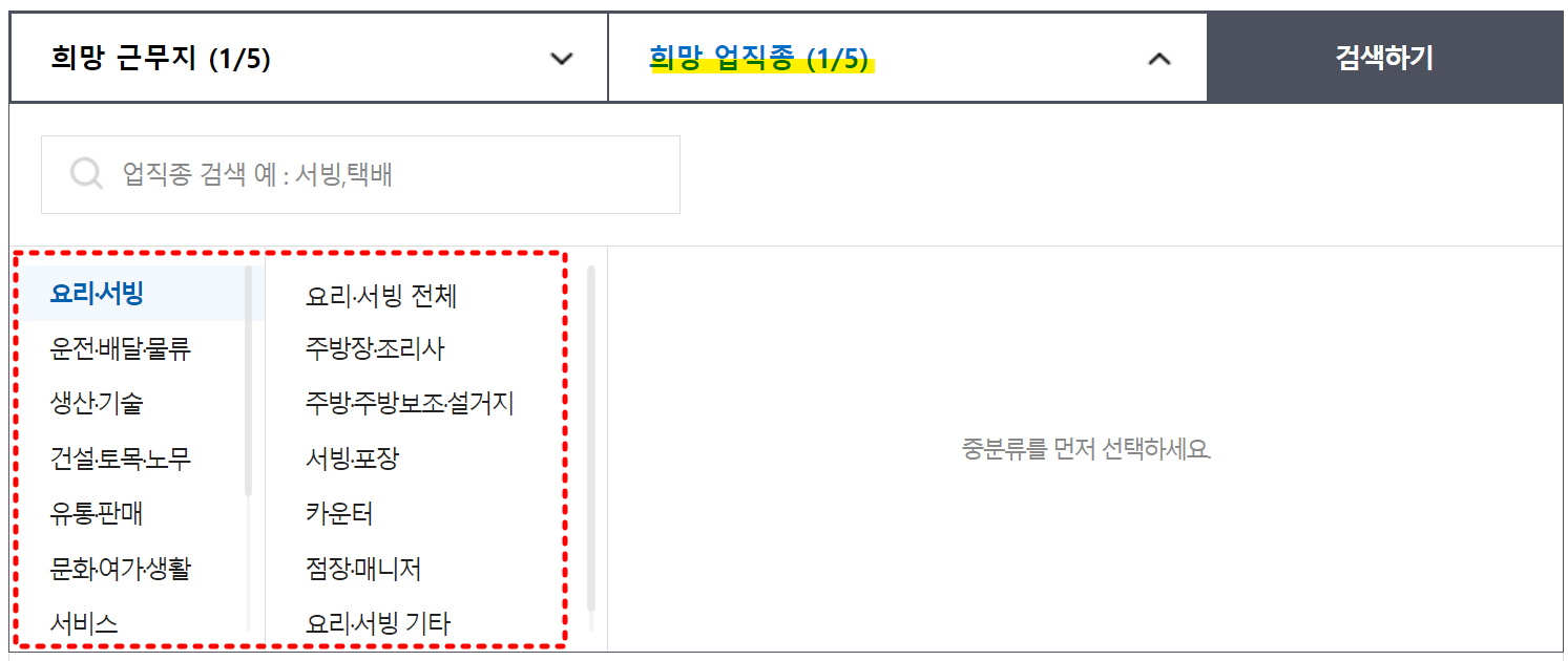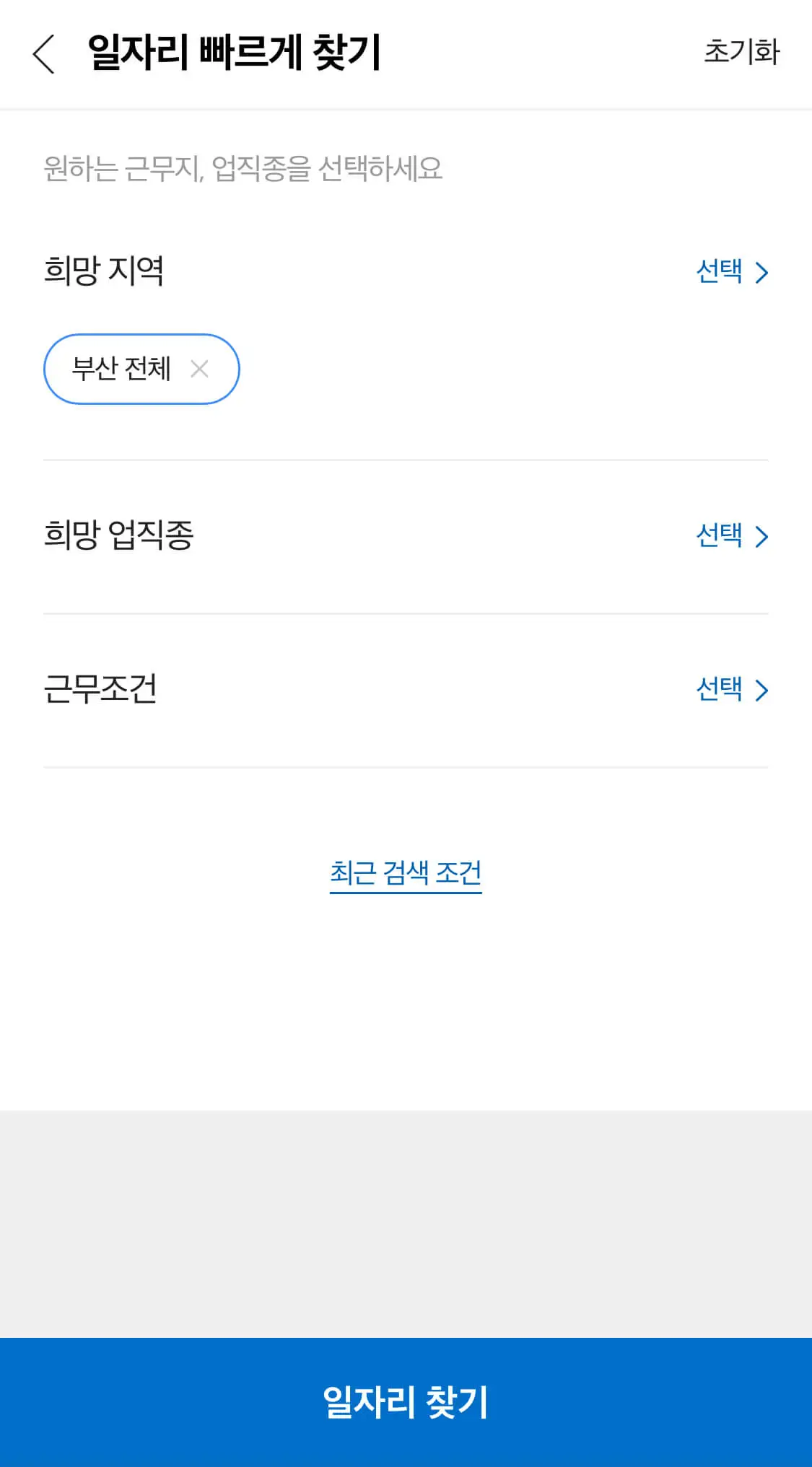 본인이 희망하는 근무지와 업직종을 선택하여 원하는 조건의 일자리를 바로 찾아보실 수 있습니다.