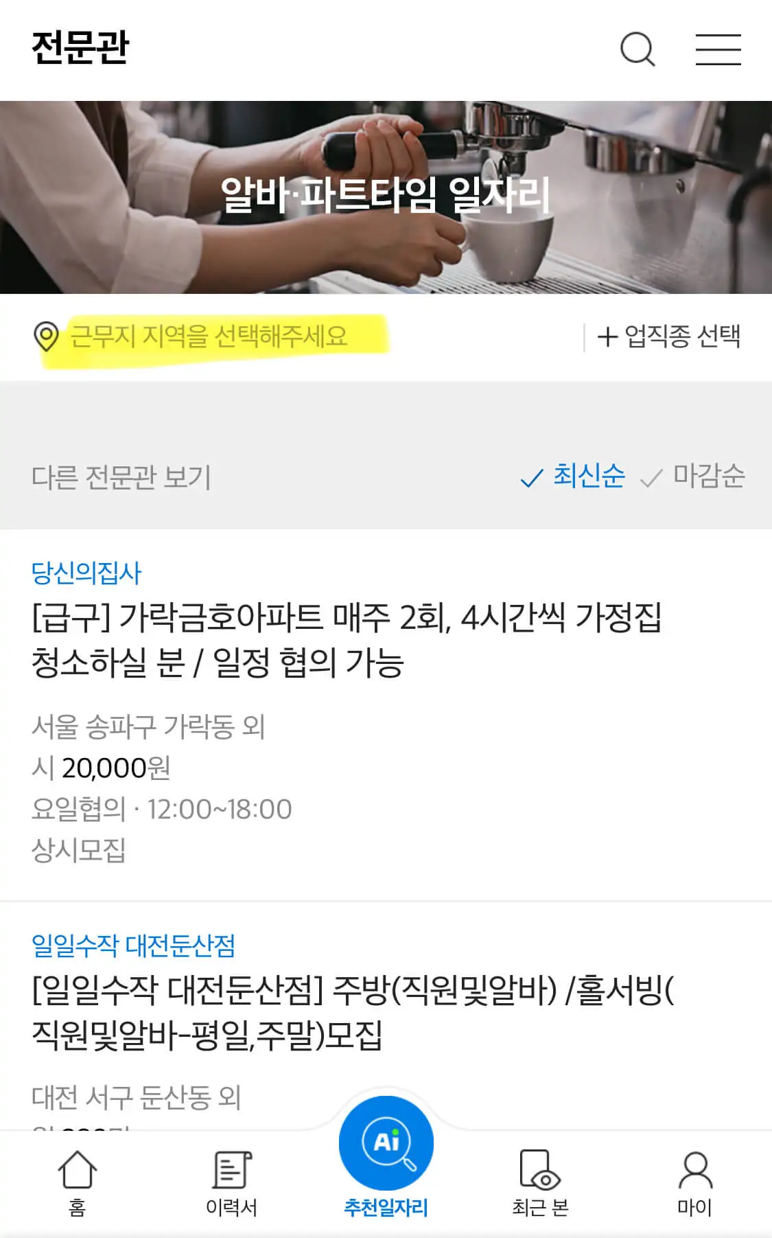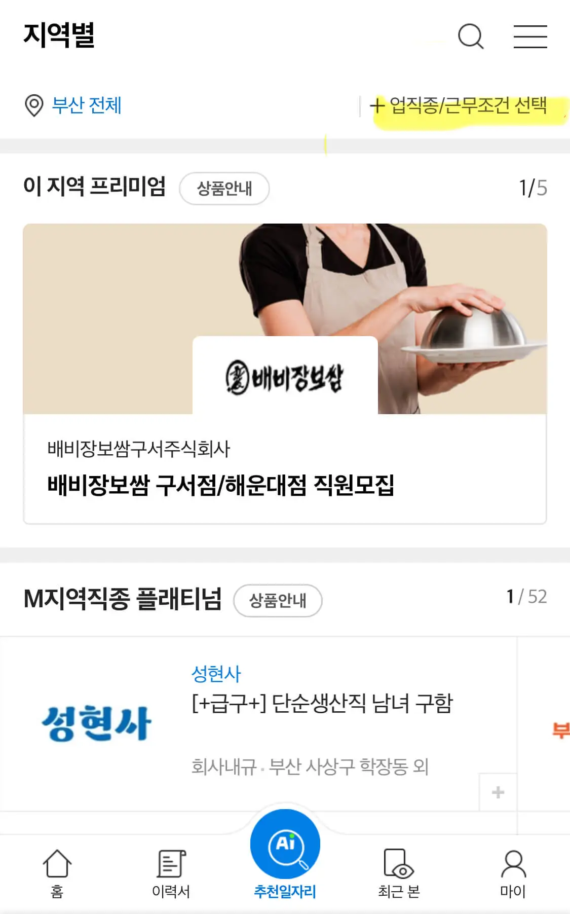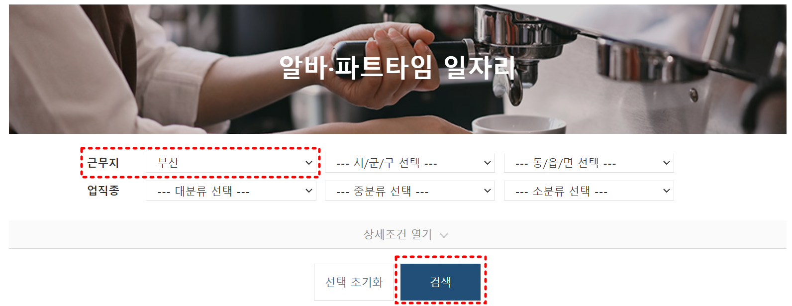 마찬가지로 부산 전체 지역의 알바 일자리는 근무지만 부산으로 선택 후 검색해 보시면 됩니다.