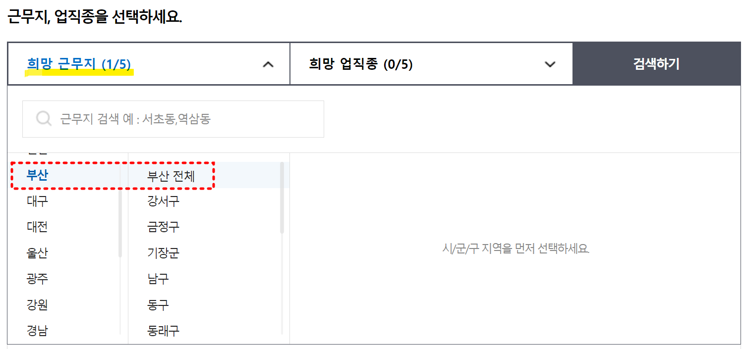 부산 지역에서 구하는 모든 일자리는 희망 근무지만 부산전체를 선택하여 검색하기를 클릭하시면 됩니다.
