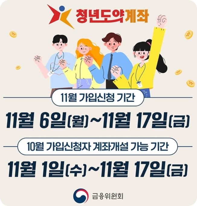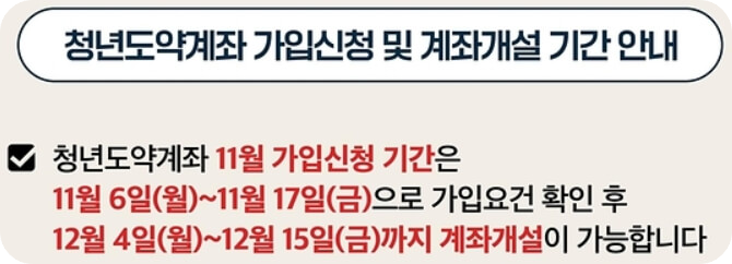 11월 가입 신청기간은 11/6일(월) ~ 11/17일(금)이며, 계좌 개설은 12/4일 ~ 12/15일로 예정되어 있습니다.
